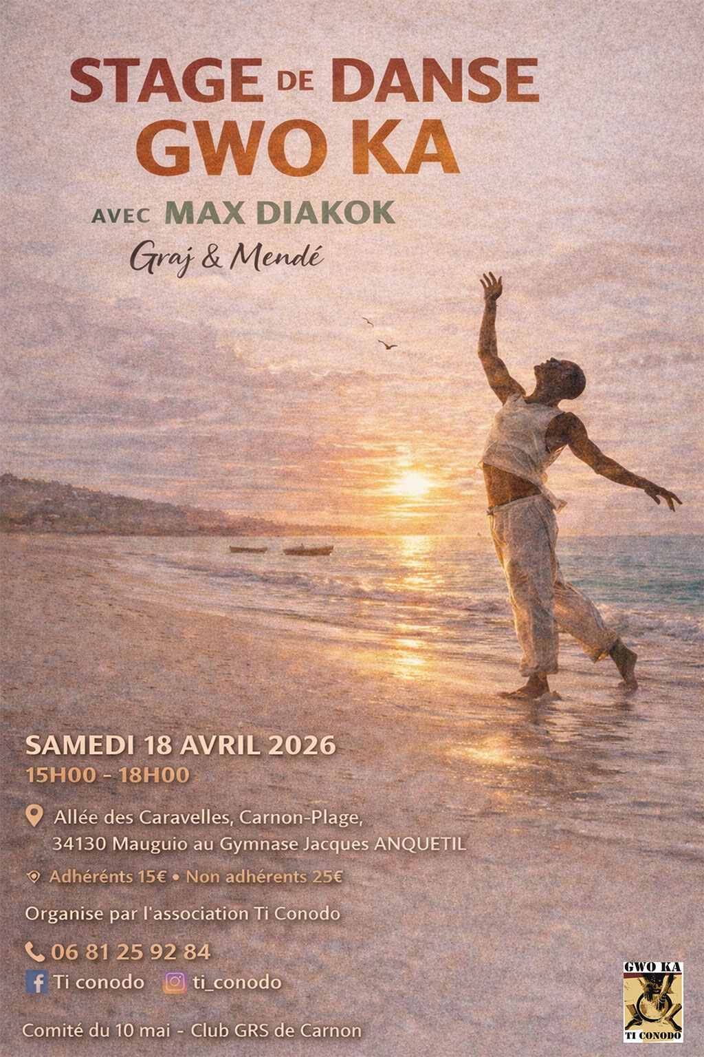 Stage de gwoka à Montpellier (34) Samedi 18 avril 2026 15h-18h Stage organisé par l’association Ti Conodo